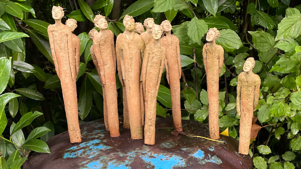Par ma passion de la terre, je m’offre des moments où je peux enfin aller au pas…enfin cesser de courir…enfin prendre le temps pour revivre les rencontres passées, méditer sur la vie de l’Homme, la vie de notre Terre. Je vais au pas dans mon atelier mais cela ne m’empêche pas de hurler à travers mes personnages qui, j’espère expriment mieux que n’importe quel mot ce que je ressens face à tous les rejets, tous les interdits de notre société….alors que chaque rencontre devrait nous rappeler que l’autre est toujours un frère, une sœur….nous rappeler aussi: